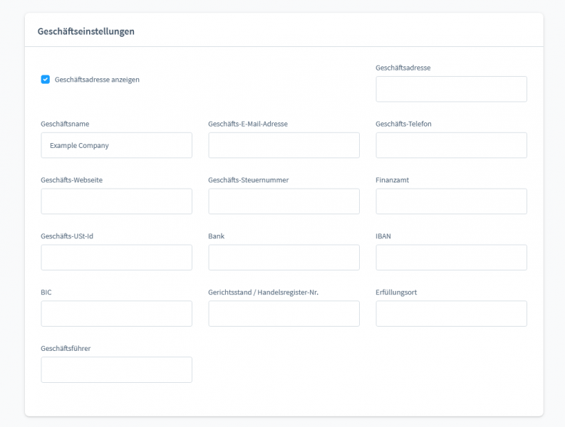 Außerdem legst du hier auch fest, ob und welche Geschäftsdaten auf Dokumenten des jeweiligen Typs erscheinen sollen. Das heißt, du pflegst hier auch Geschäftsdaten wie Bankdaten, Adressdaten usw. Und das für jede Vorlage einzeln. Das solltest du im Hinterkopf behalten, sollte sich einmal deine Kontonummer oder deine Adresse ändern! In diesem Fall müssen die Daten, wenn dort angegeben, für jede Vorlage geändert werden.