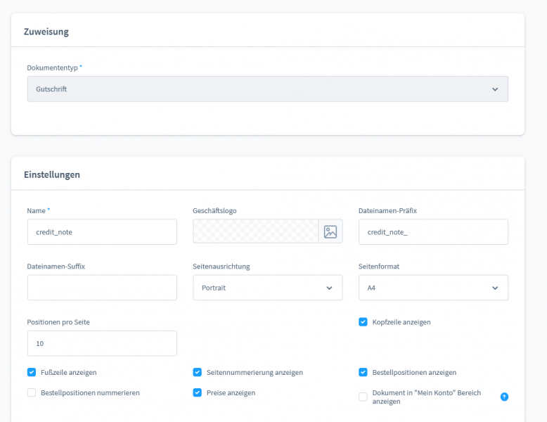 Unter Einstellungen findest du den Punkt Dokumente. Hier liegen alle Dokumentvorlagen für die dein Shop PDFs erstellt, wie zum Beispiel Rechnungen oder Gutschriften. In diesen Vorlagen kannst du verschiedene Konfigurationseinstellungen vornehmen, wie zum Beispiel einen festen Dateinamen-Präfix, aber auch ein Logo hinterlegen oder das Dateiformat ändern.