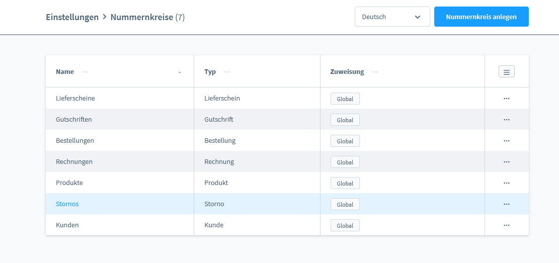 Nummernkreise kannst du in den Einstellungen verwalten. Dort ist im Standard schon für jeden Typ ein Nummernkreis angelegt. Du kannst beliebig viele weitere anlegen.