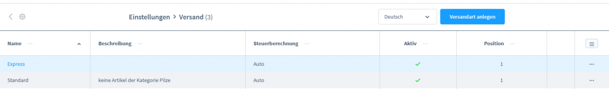 Deine Versandregeln pflegst du in Shopware unter Einstellungen -> Shop -> Versand. Hier kannst du beliebig viele Versandregeln festlegen. Im Standard liefert Shopware zwei Versandregeln aus, Standard und Express.