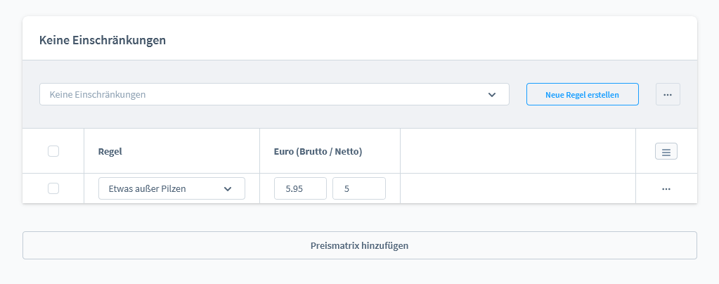 Du kannst deinen Steuersatz festlegen und beliebig viele Preisregeln erstellen. Auch hier kannst du wieder Regeln festlegen die steuern, wie hoch deine Versandkosten sind. So kannst du zum Beispiel ab einem bestimmten Warenkorbwert kostenfreien Versand anbieten, oder für unterschiedliche Gewichte deines Warenkorbes verschiedene Preise. Alle Verfügbarkeitsregeln erstellst du im Rule Builder unter Einstellungen -> Shop -> Rule Builder.