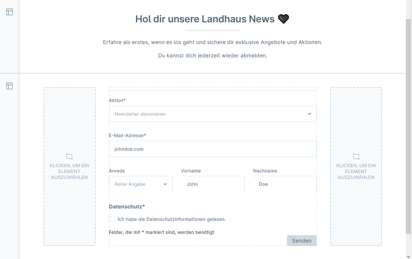 - Fülle die Seite mit beliebigen Inhalten, z. B. mit einem Text und einem Formular für die Newsletteranmeldung. Ich habe hier ein Spaltenlayout für das Formular verwendet, damit rechts und links etwas "Luft" ist und das Formular kompakter und benutzerfreundlicher wirkt.