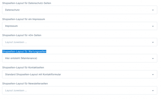 - Gehe nun auf Einstellungen → Stammdaten, und scrolle ein Stück runter. Unter "Shopseiten-Layout für Wartungsseiten" müsstest du deine neu angelegte und gefüllte Wartungsseite finden. Wähle diese aus und speichere.